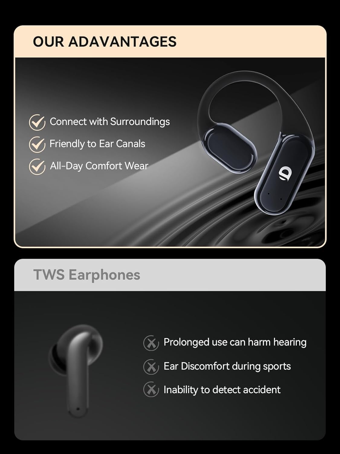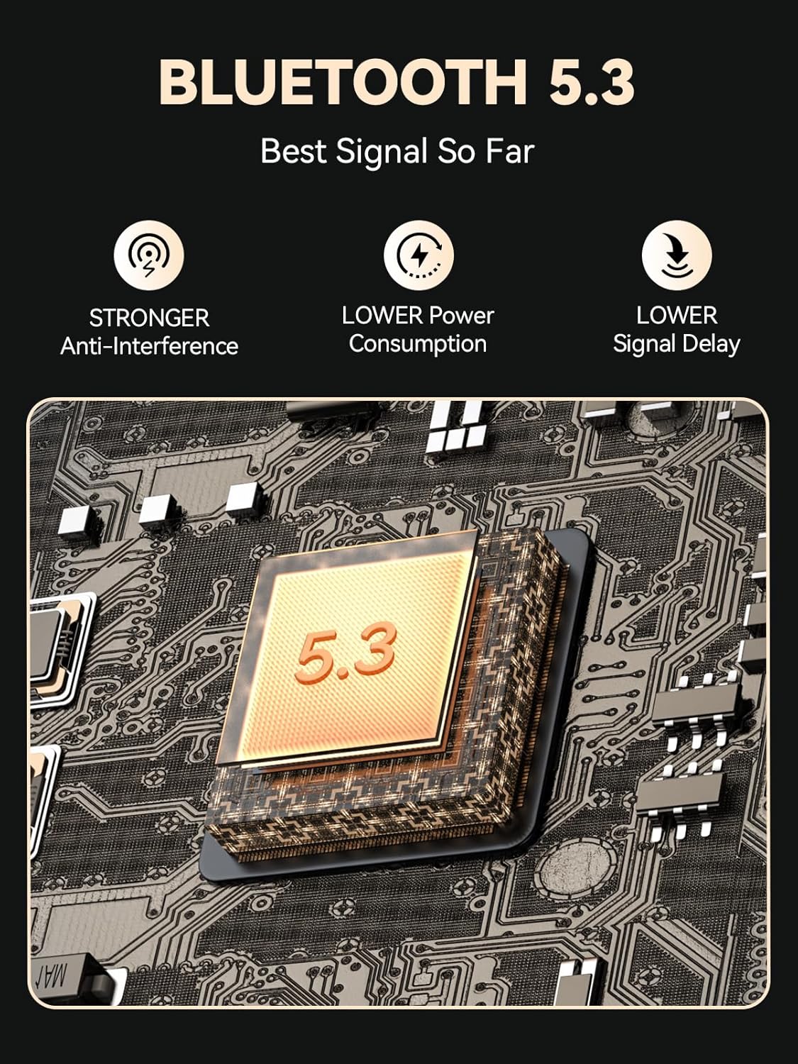 [ Superior AAC Audio, Pioneering Bluetooth 5.3 ] – Our OWS earbuds feature cutting-edge Bluetooth 5.3 with a 48 Mbit/s transfer rate, 300 m range, and just 60 ms latency for smooth music sync. With AAC/SBC audio support and advanced noise interference reduction, they can deliver an exceptional experience.
